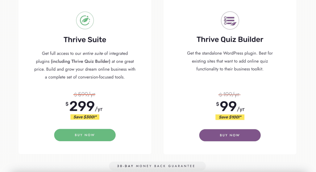 Currently, Thrive Suite Quiz Maker costs $99 paid annually and the complete Thrive Suite costs $299 paid annually or $149 paid quarterly. It comes with a 30-day money-back guarantee just in case it falls short of your expectations.